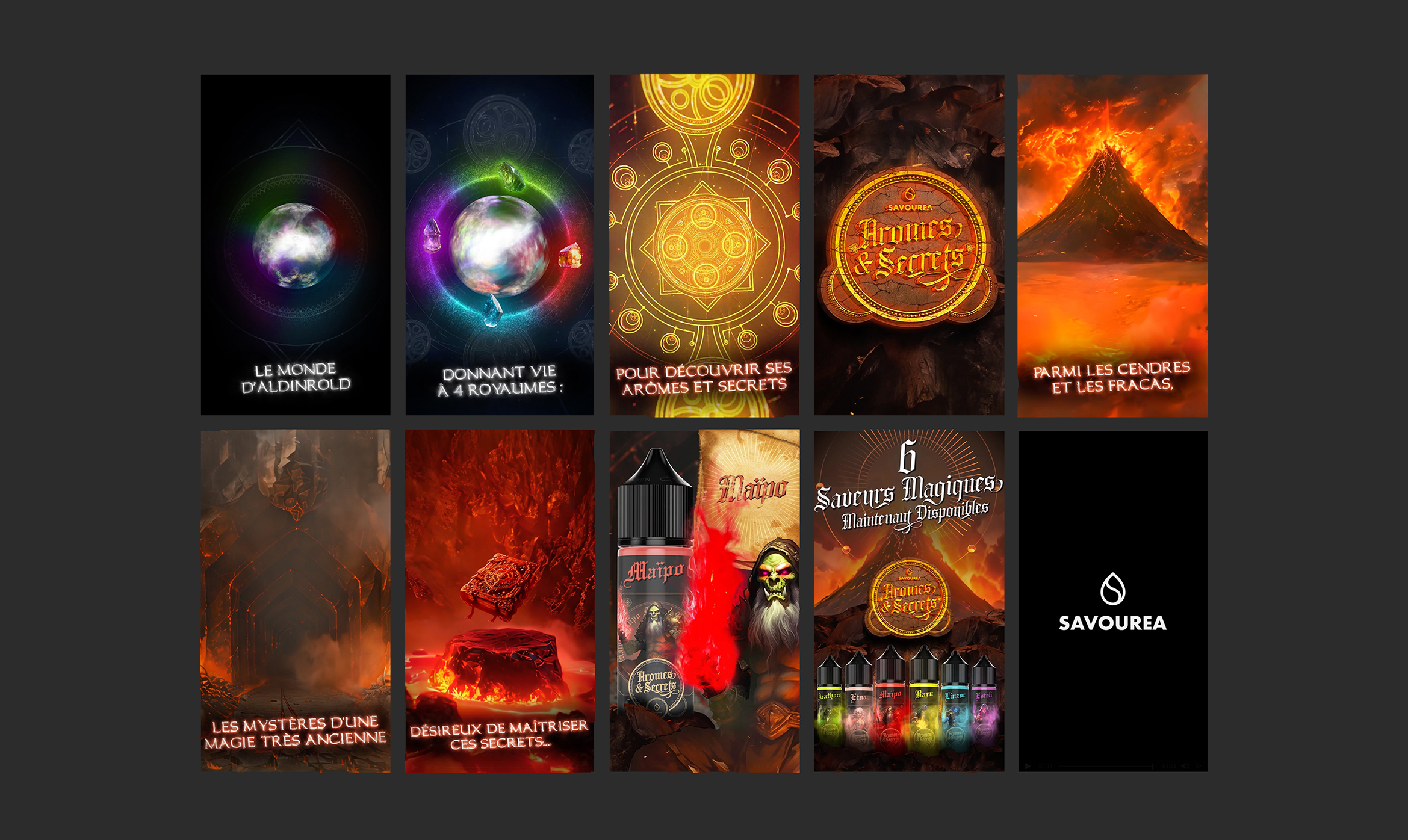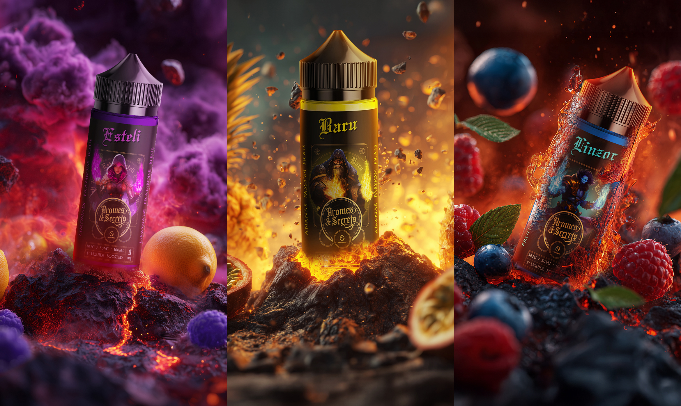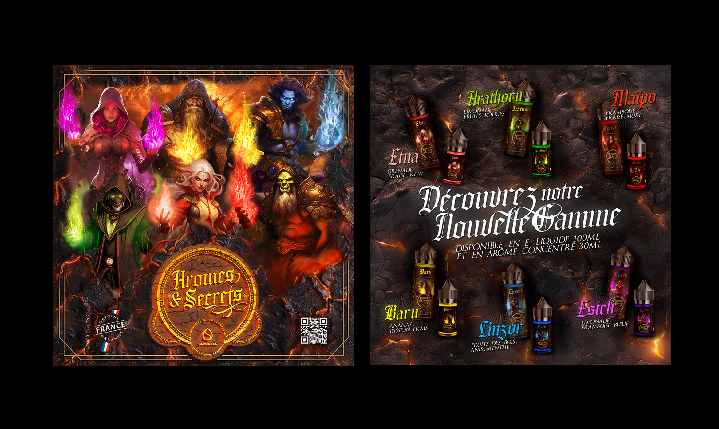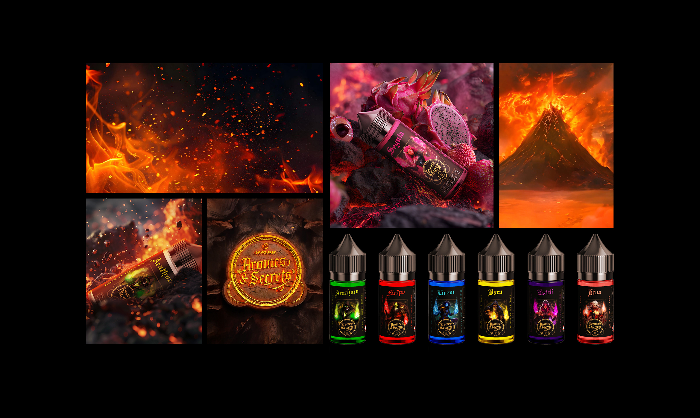 Découvrez l’univers vape d’Arômes & Secrets, où chaque création est pensée comme un voyage sensoriel entre mystère et intensité. Inspirée par des personnages puissants et des saveurs soigneusement équilibrées, la marque révèle une identité forte, à la fois élégante et intrigante. Du concept visuel aux packagings, chaque détail a été conçu pour traduire l’âme de la gamme et sublimer l’expérience, bouffée après bouffée, comme un secret que l’on découvre lentement.